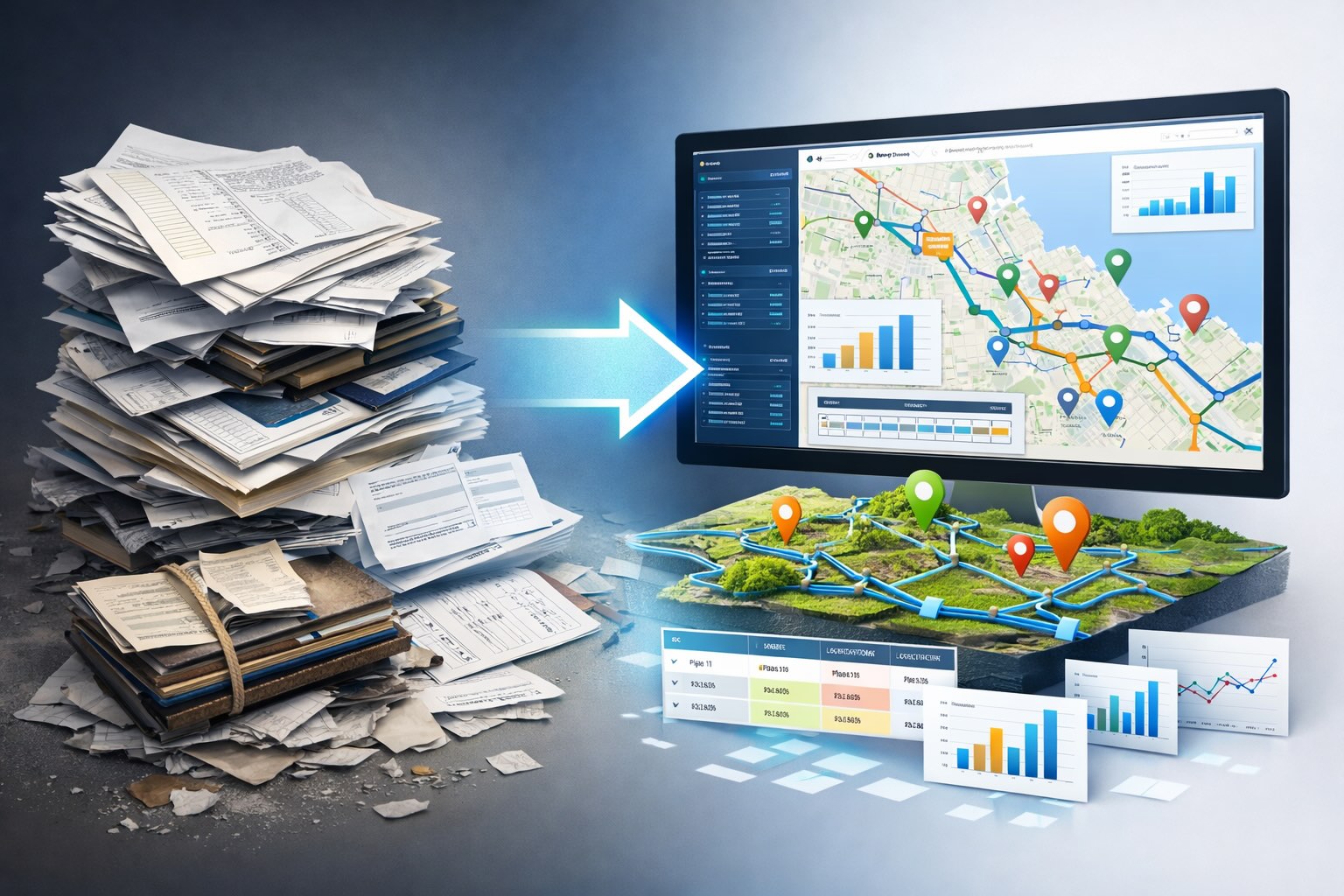 Unstructured legacy PDFs and scattered logs are converted into structured digital insights that can actually be reported on and mapped.